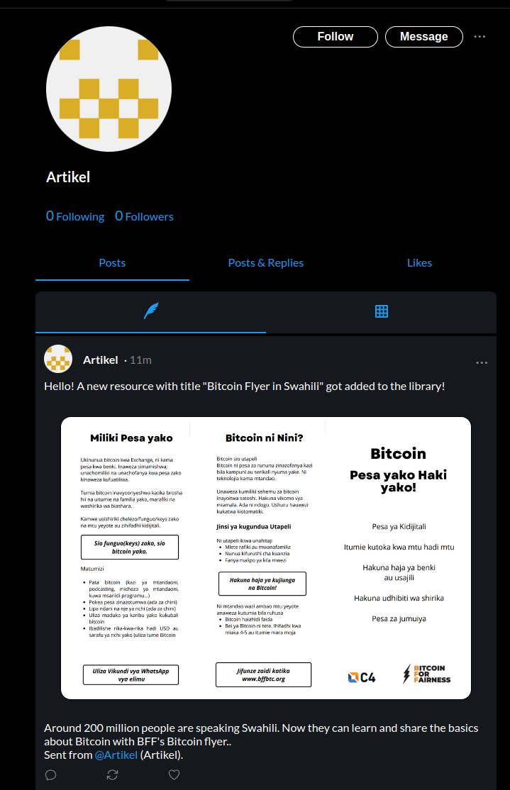 "content": "Hello! A new resource with title \"Bitcoin Flyer in Swahili\" got added to the library!\n https://blotcdn.com/blog_378314d0a9ec45bfa46b3bc7d3718410/_thumbnails/b0cefa01-8abe-42ed-89fe-d6a1e79b6e11/large.png\nAround 200 million people are speaking Swahili. Now they can learn and share the basics about Bitcoin with BFF's Bitcoin flyer..\nSent from nostr:npub1j8wdpuqqct23l4gyyxa5dkjvgkxzkjh3n3mzzjj79uhcvh424pcqurytqu (Bitcoin Library).\n ",